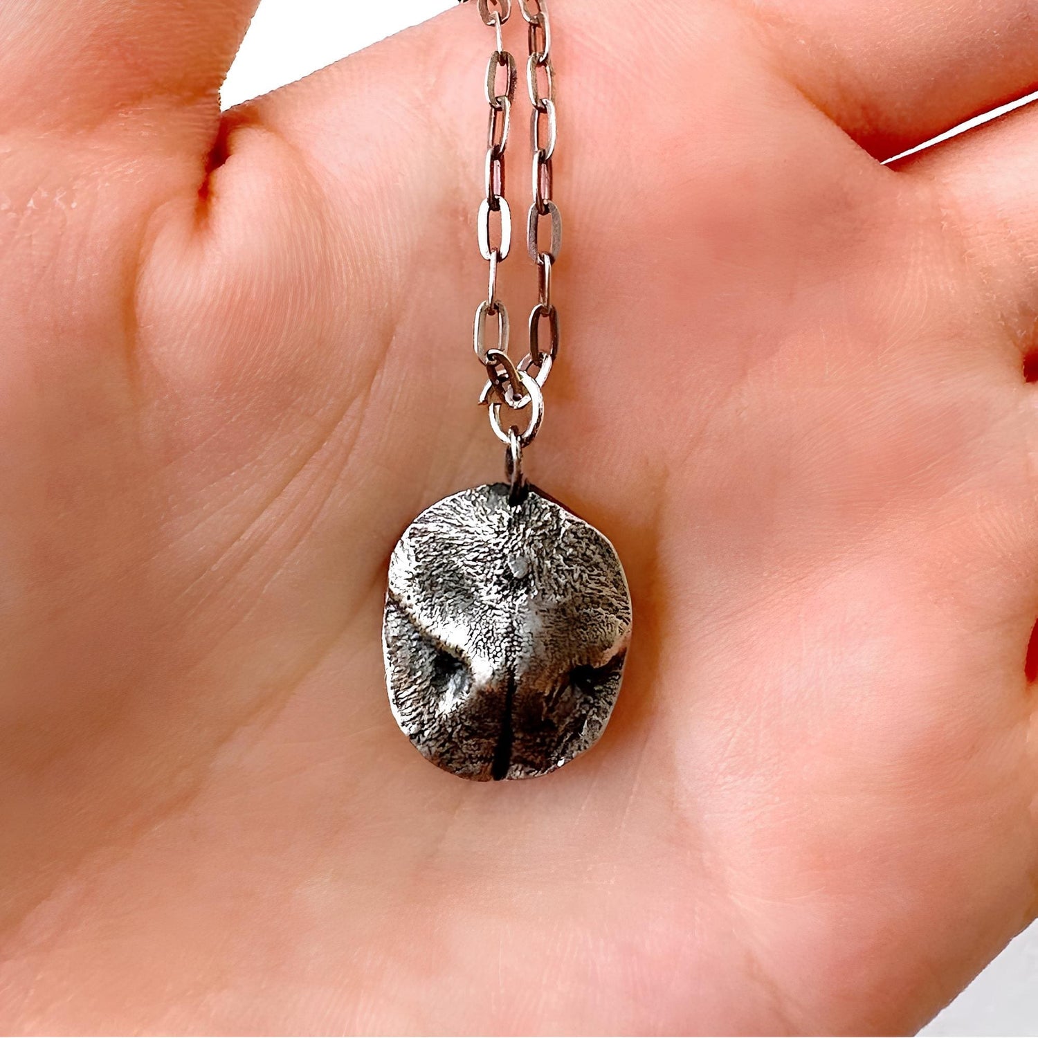 使用銀黏土進行鼻紋拓印,完整保留毛孩鼻頭的紋路細節,燒製後成為真正的999純銀飾品